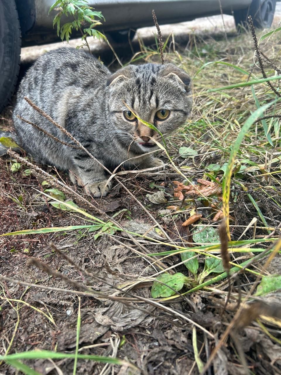 Замечена молодая кошечка, серая с полосками. Похожа на шотландскую вислоухую.