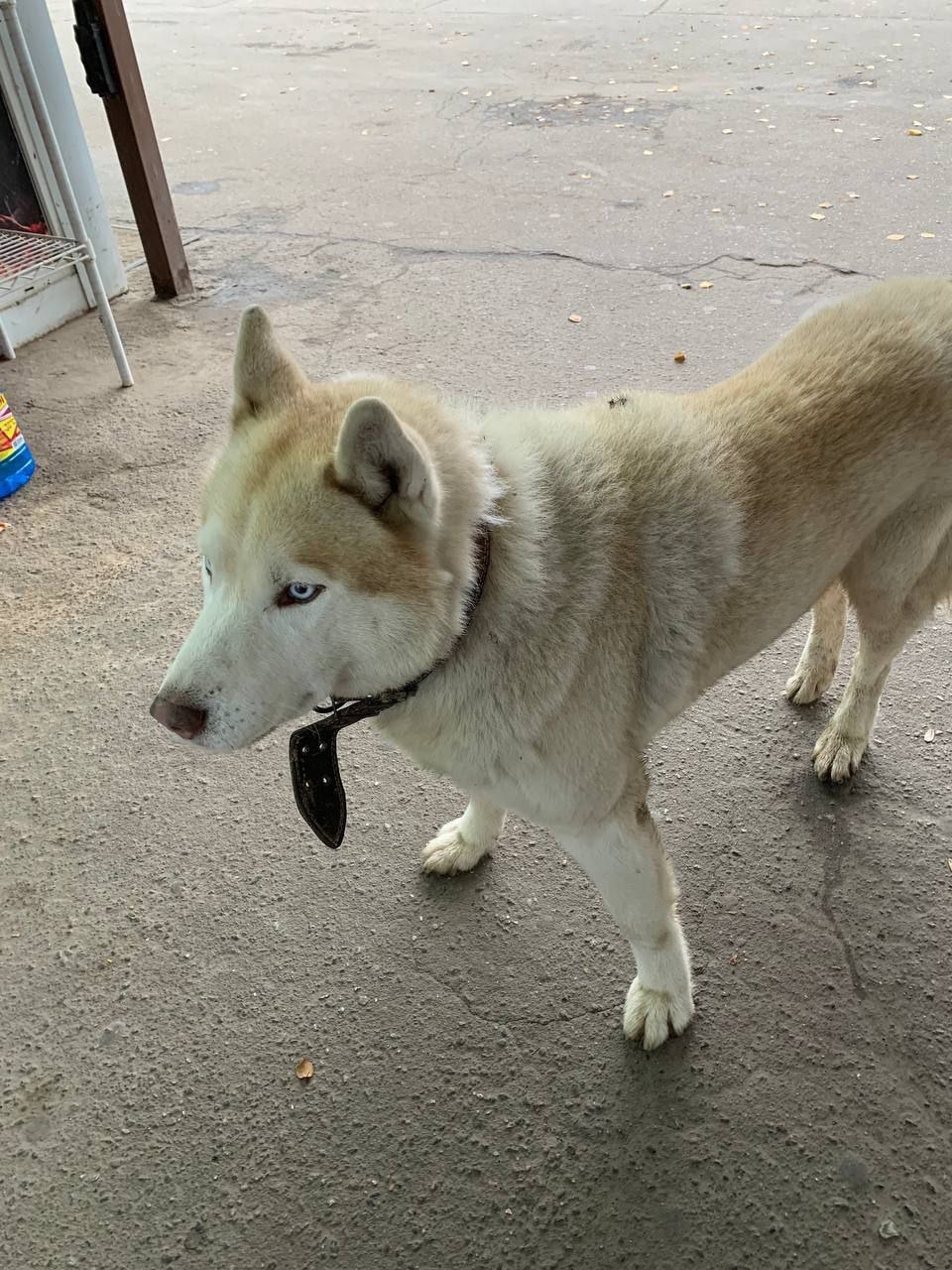 Хаски, окрас рыжий с белым, голубые глаза, с ошейником, прихрамывает на заднюю лапу