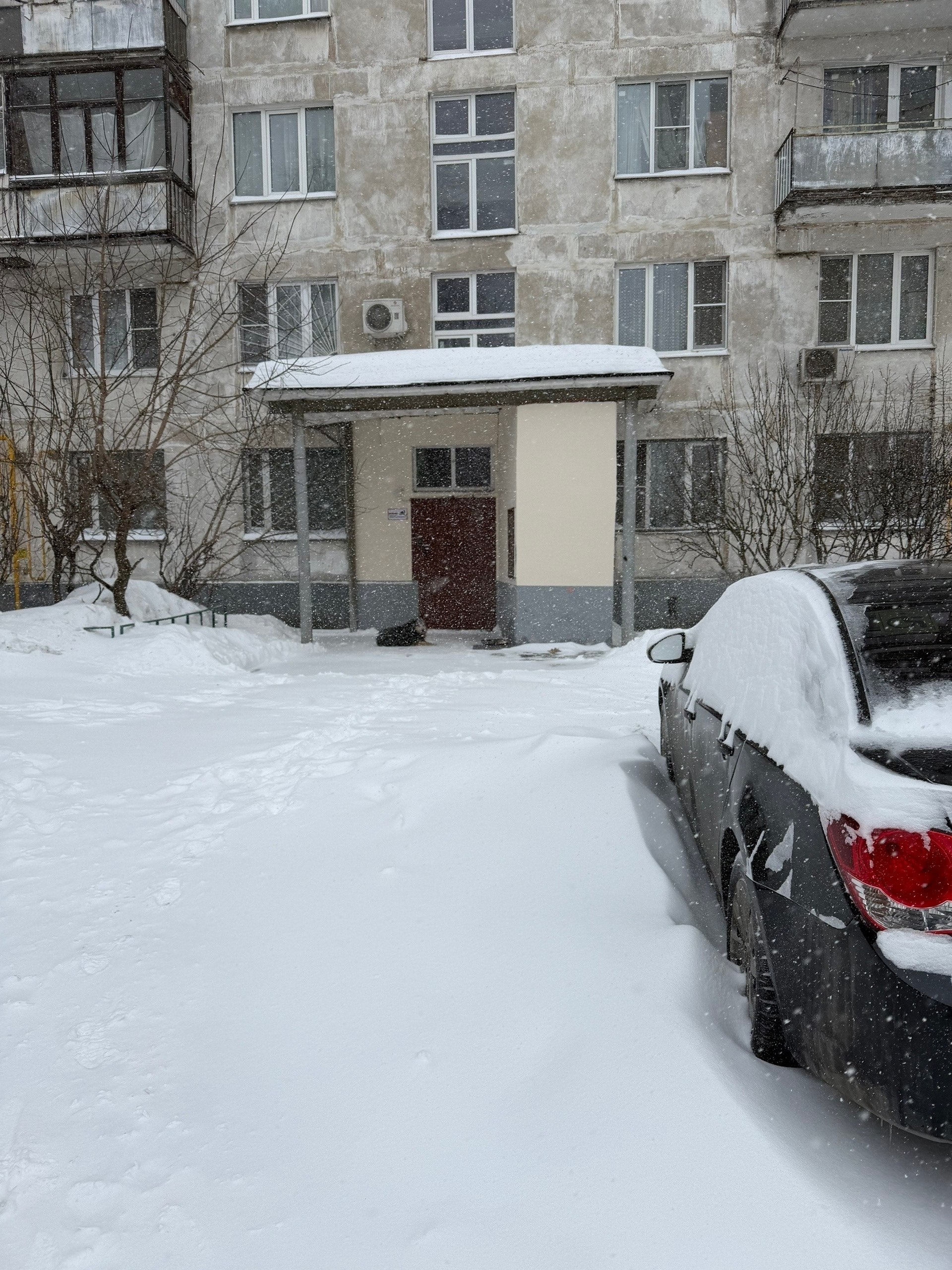 У подъезда второй день сидит собака. Далеко от дома не отходит, от еды отказывается, явно кого-то ждёт. Может кто-то ищет потеряшку.