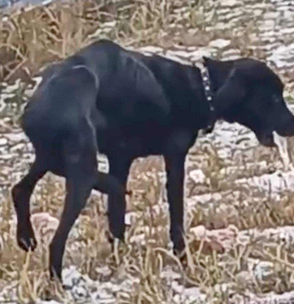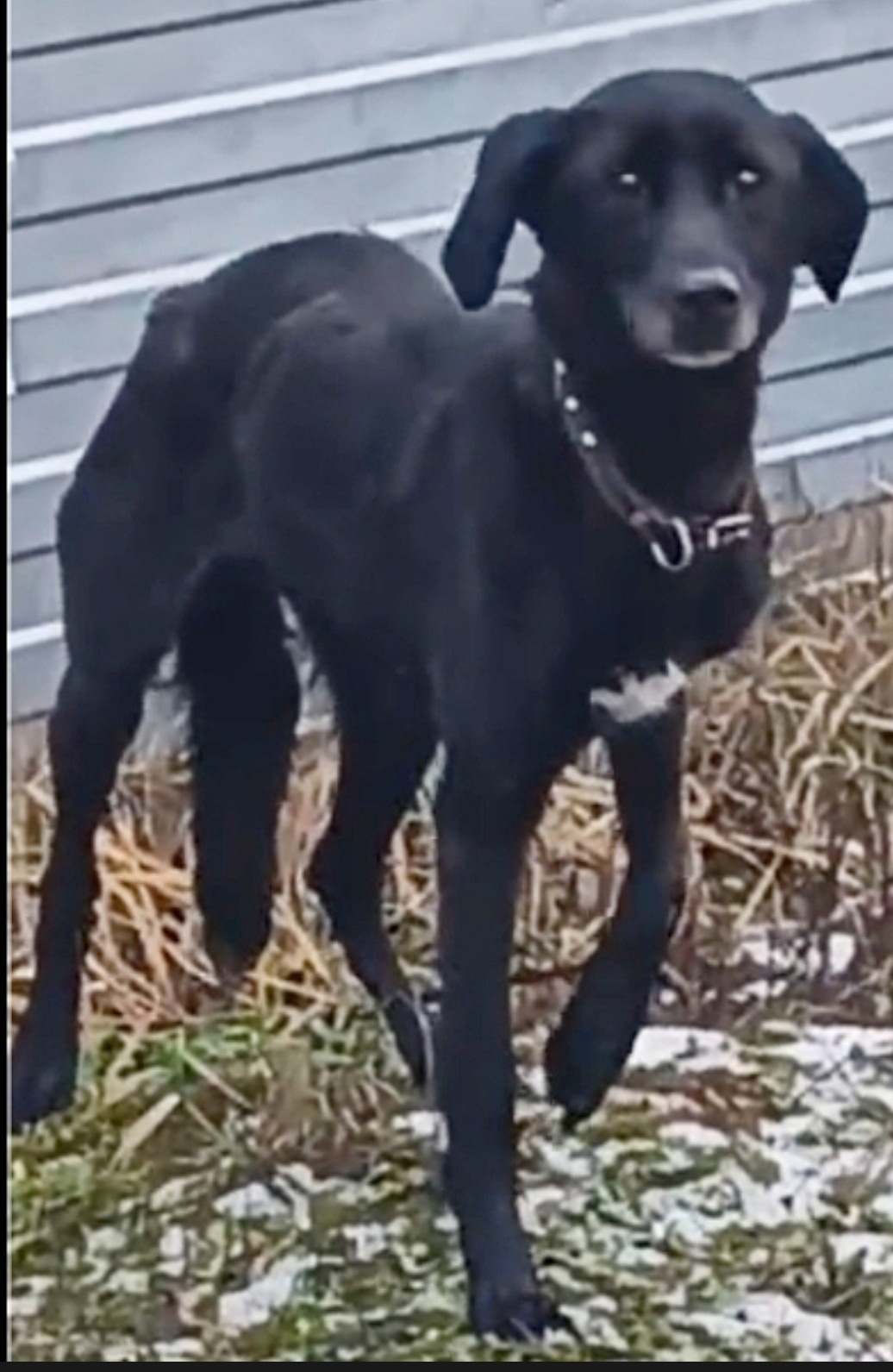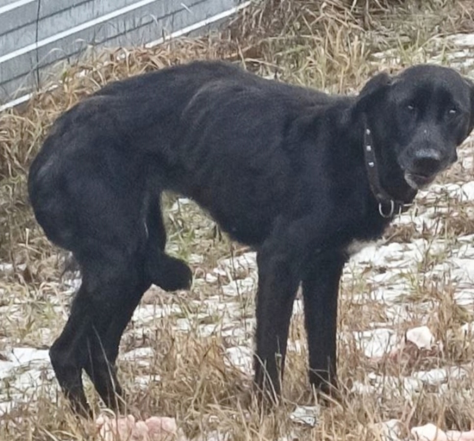 18.-20.12. Пол не известен, но возможно сука чёрного окраса с белым пятном на груди, на кончике морды вроде как седина, в кожаном ошейнике с металлическими клепками. Собака сильно истощена, в стрессе, руки не даётся, придержать невозможно.