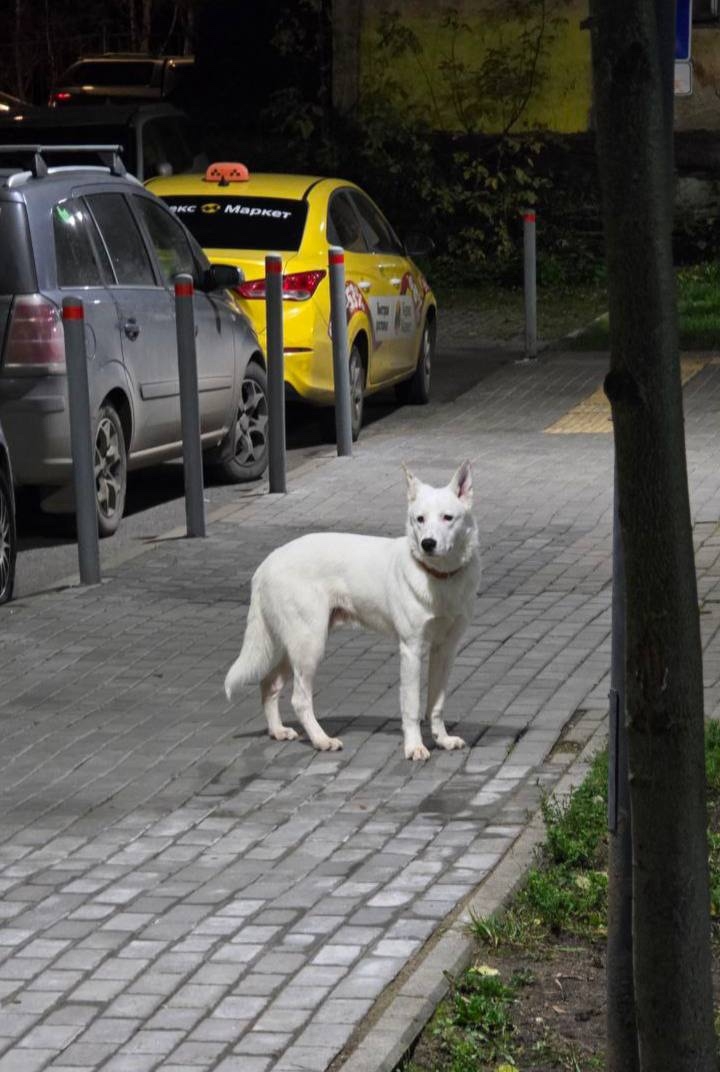 Добрый вечер! Видимо, потерялась собака, людей не подпускает, возможности посмотреть, есть ли информация на ошейнике, нет, видно, что ищет кого-то.