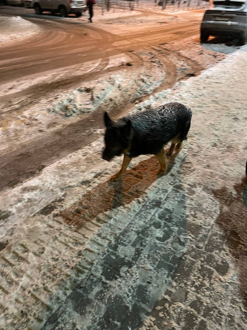 У Одинбурга уже час ходит овчарка. С ошейником. Не агрессивная. Ходит, нюхает машины.