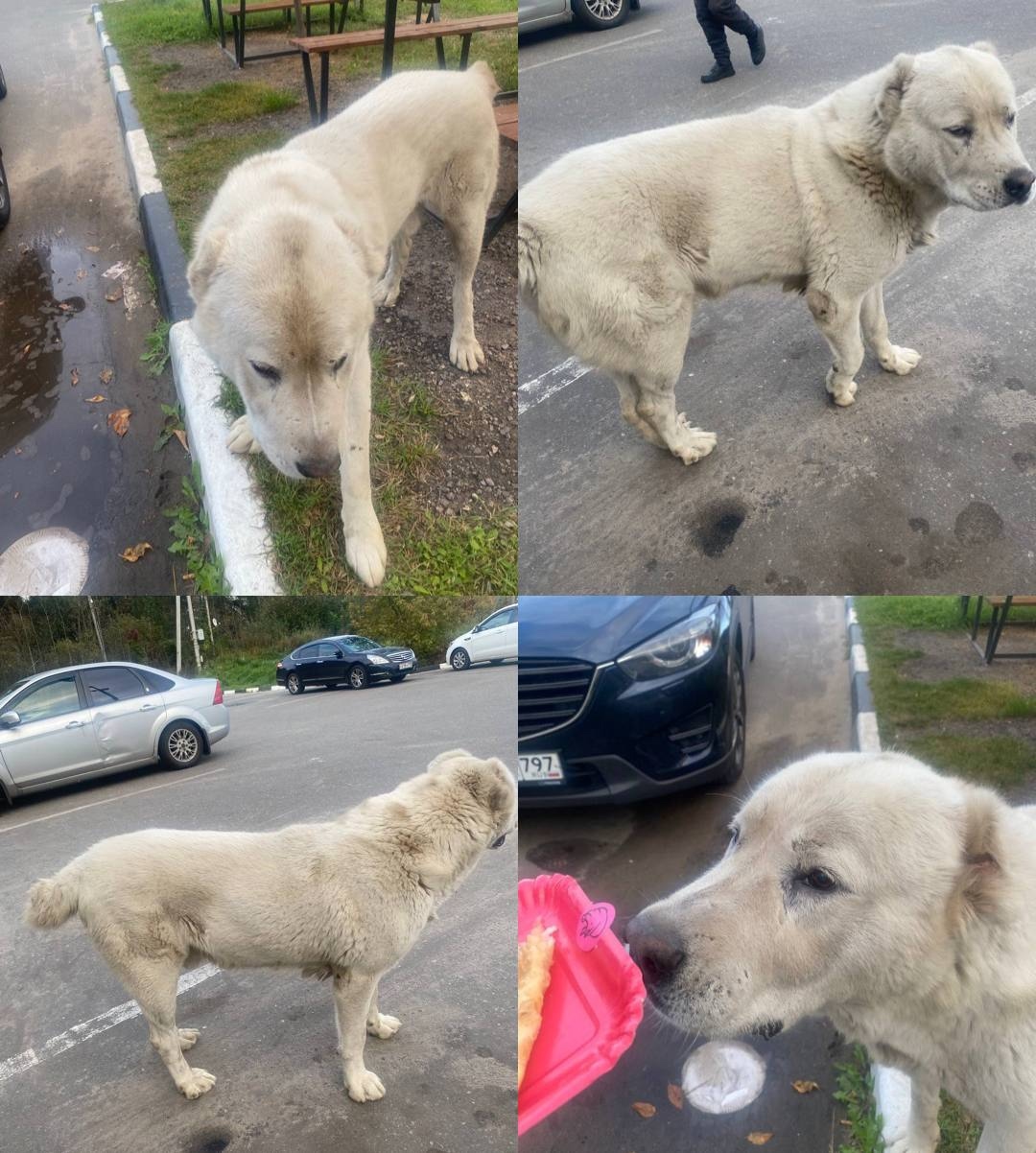 Алабай? Около заправки и около кафе Помпончик. Огромный пёс. В кафе сказали вторые сутки тут. Люди кормят тем, что выносят из кафе. Очень приятное животное