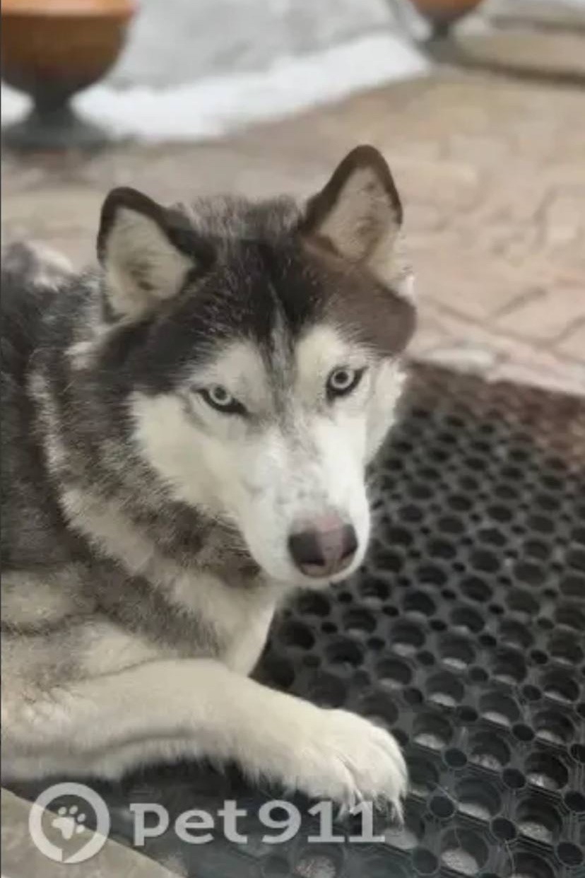Собака хаски , по виду молодая , щенок я думаю еще . Черно белая , глаза голубые. Вроде бы девочка.