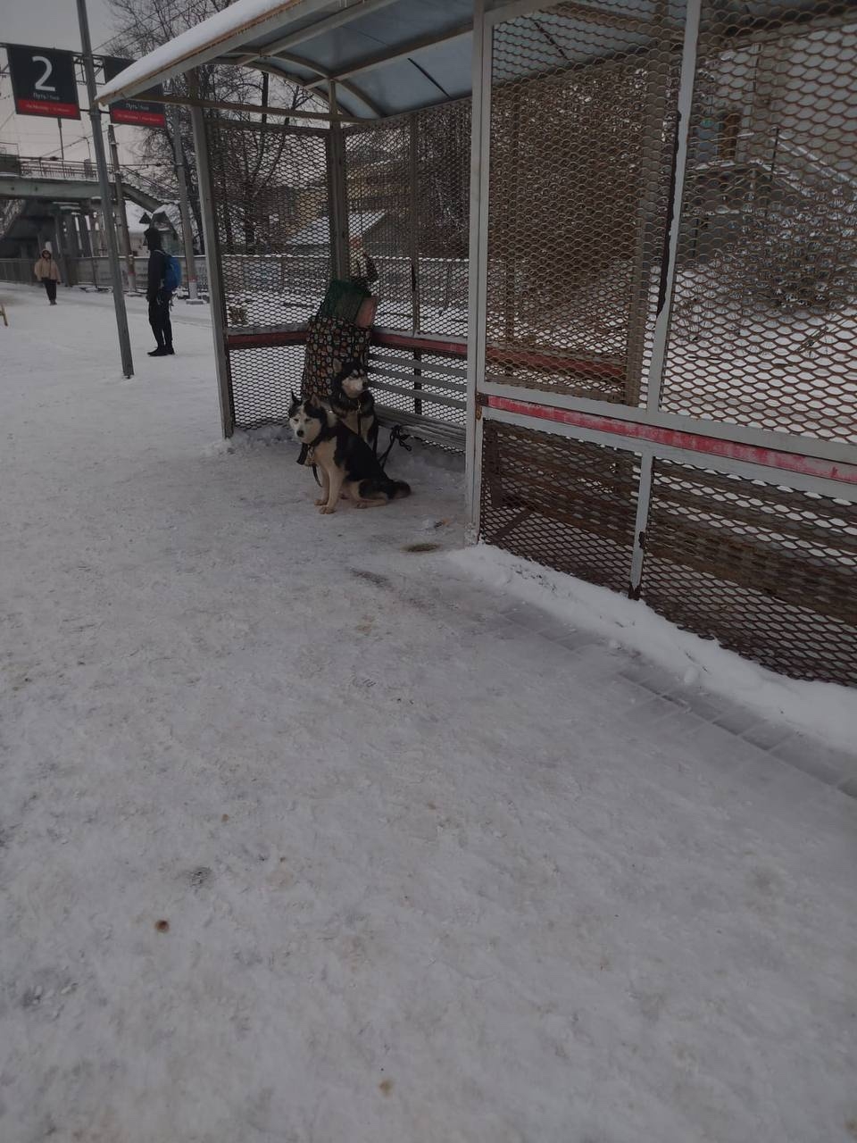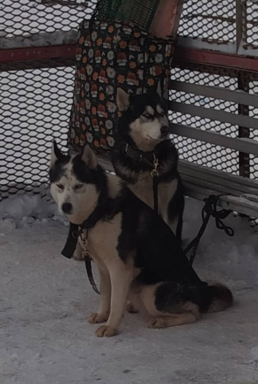 На станции привязаны 2 собаки породы хаски, хозяина не видно, просят передать дальше,