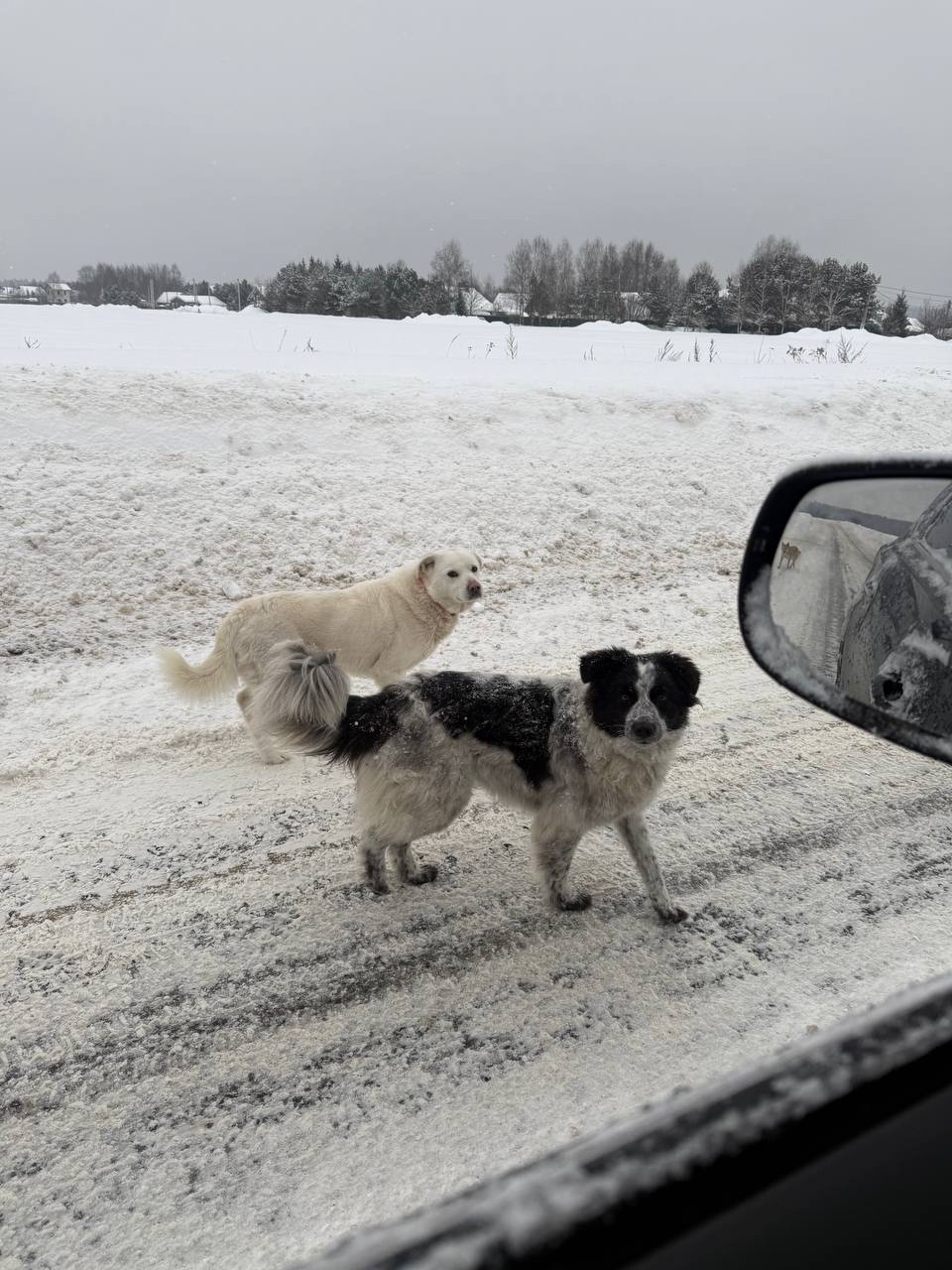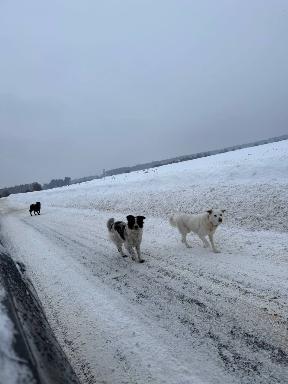Никольское, бегут в сторону Старого городка. 4 собаки, маленькая рыженькая еще (нет на фото). Белая в оранжевом ошейнике и пятнистая похожи на домашних