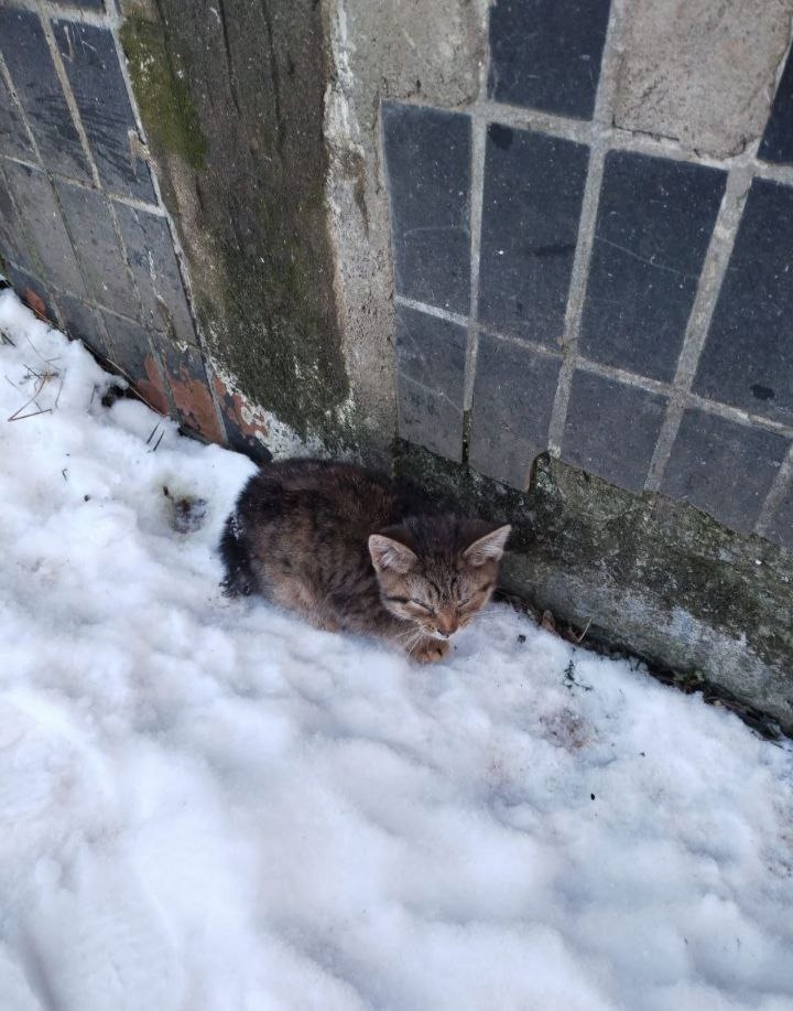 На улице минус 15, а котенок, сжавшись совсем один, маленький, с воспалёнными глазами пытается не замёрзнуть насмерть у бетонной стены…