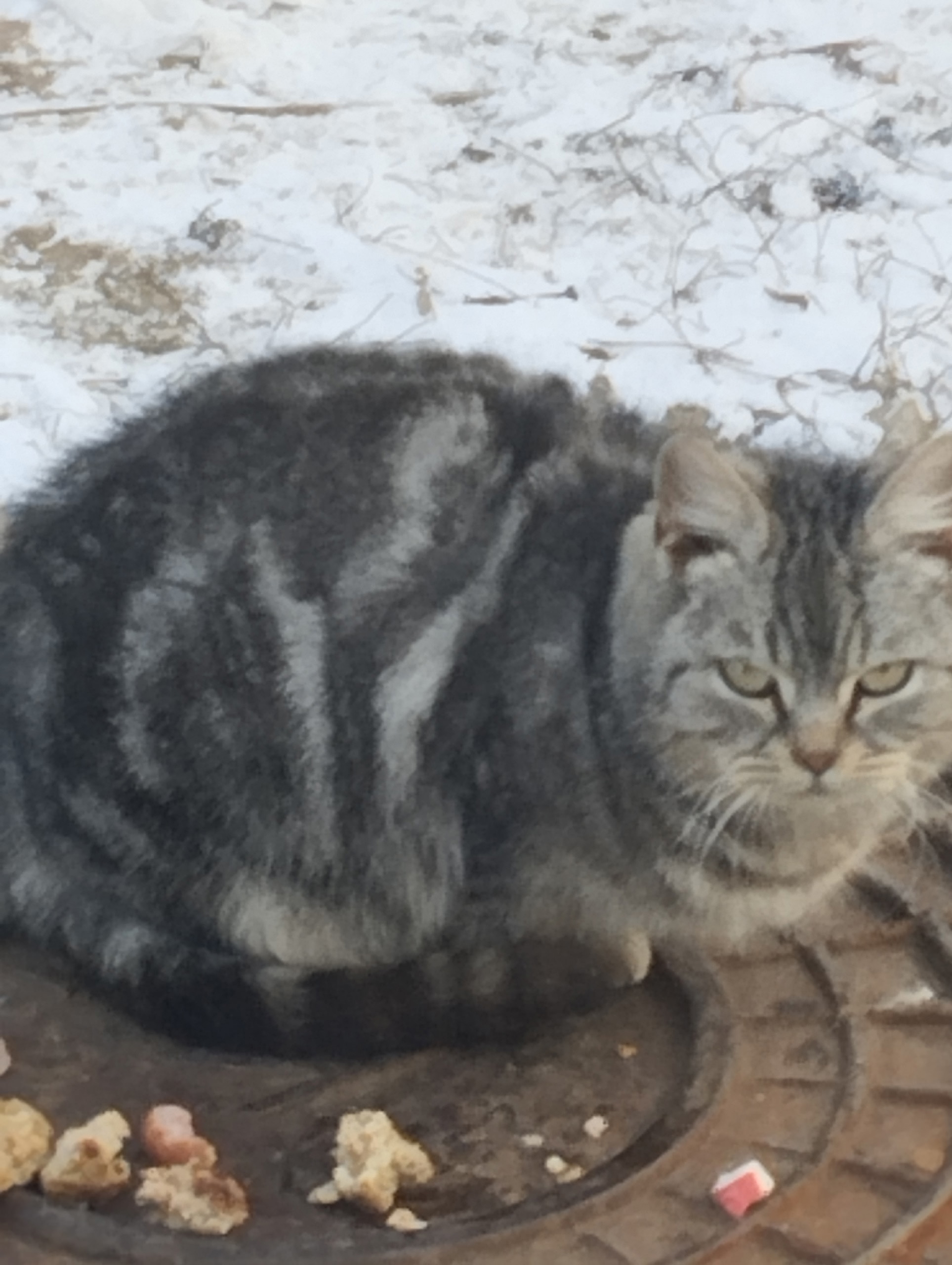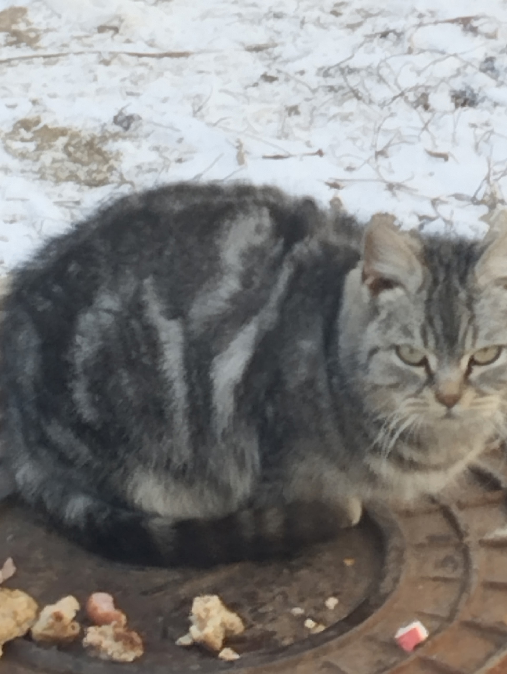 Замерзает на люке кошечка. В руки не даётся. Подкармливаем. Спит..