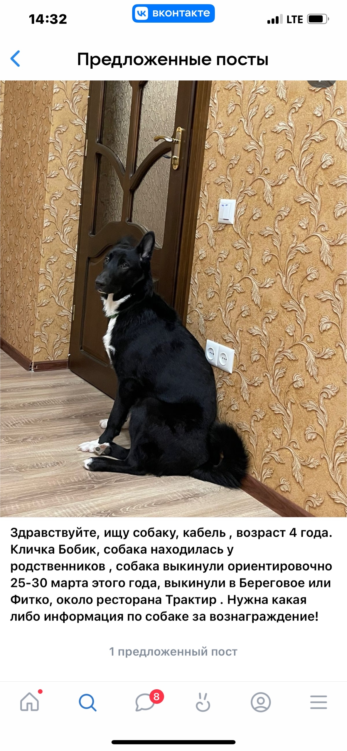 Кличка Бобик, собака находилась у родственников , собака выкинули ориентировочно 25-30 марта этого года, выкинули в Береговое или Фитко, около ресторана Трактир . Нужна какая либо информация по собаке за вознаграждение!