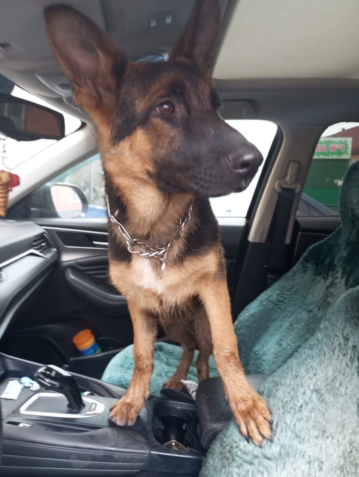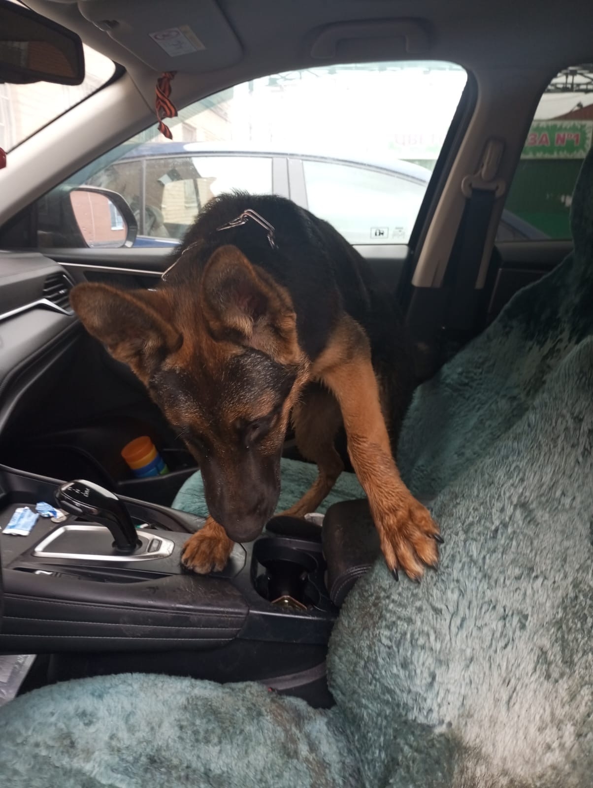 Овчарка, девочка, с ошейником-цепью. Чистая, не боится сидеть в машине.