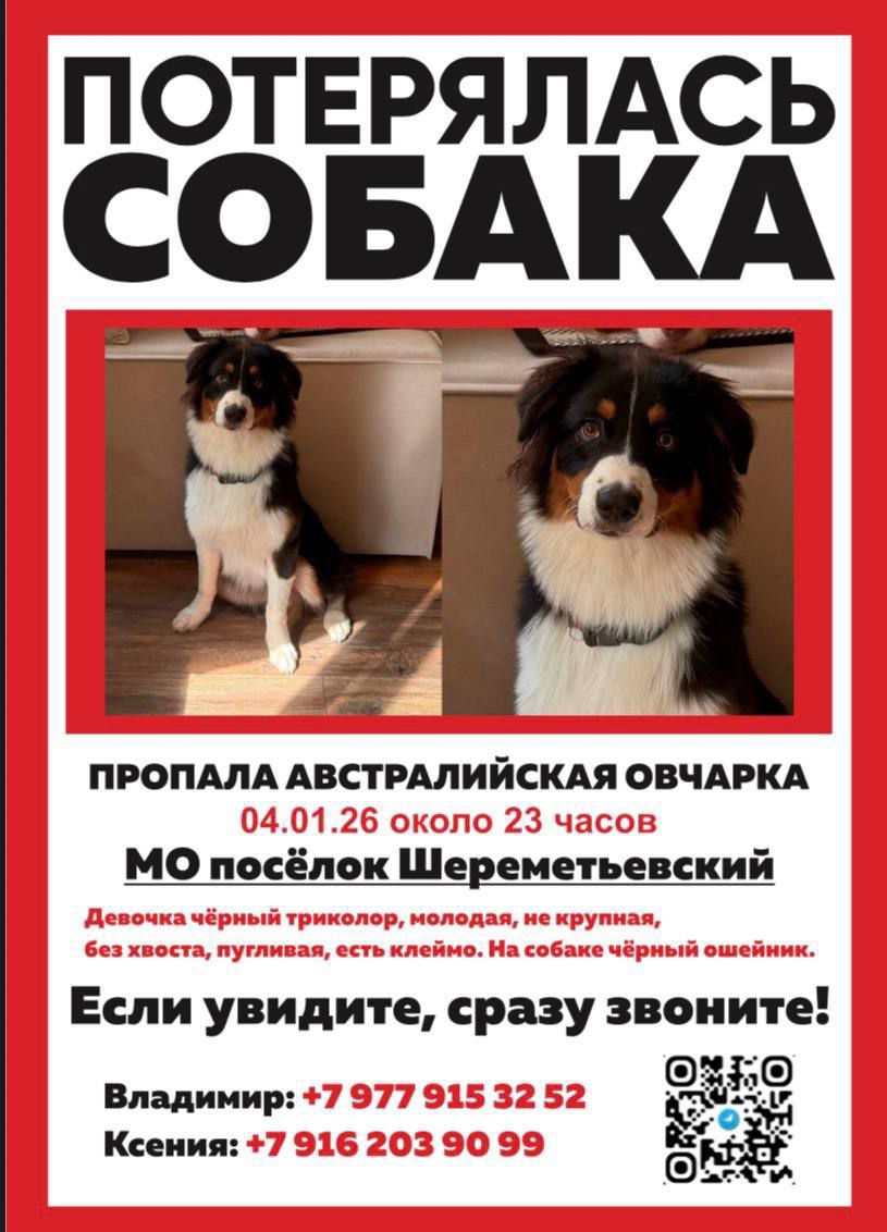 Пропала собака породы Аусси, девочка чёрный триколор без хвоста, на ней чёрный ошейник.
