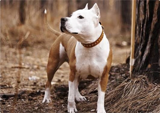 Здравствуйте. Сейчас на Книжном 13, пересечении Урицкого бегает собака (или стаф или пит, простите но я в них не разбираюсь ) Точно чистокровный, очень красивый, крупный, ухоженный, без ошейника, голова полностью белая, есть рыжее по туловищу. Видно, что потерялся, бегает ищет, заглядывает в подъезды, видно что растерян. Я была без телефона, фото похожее из интернета. Бегает кругами по этой местности