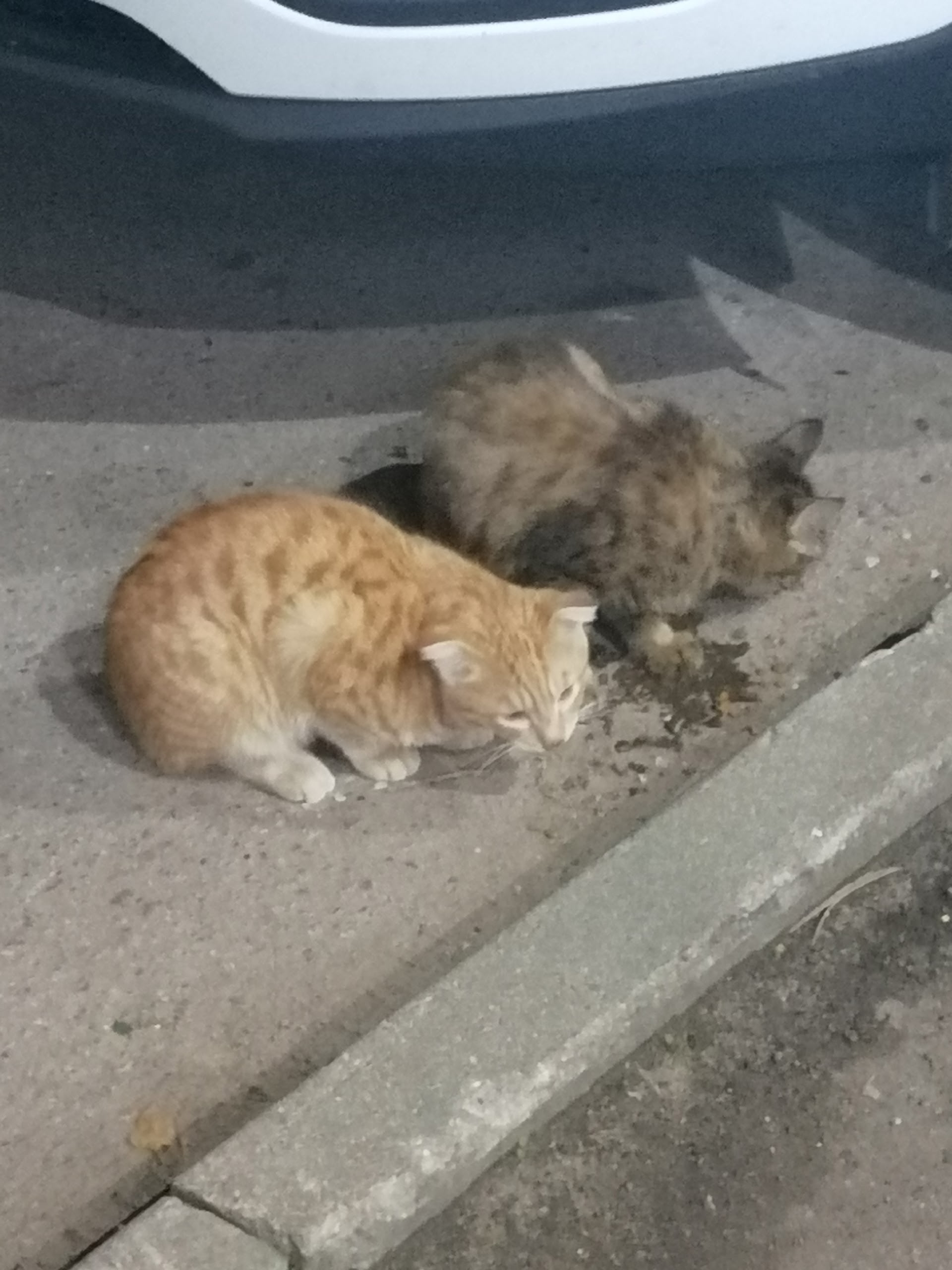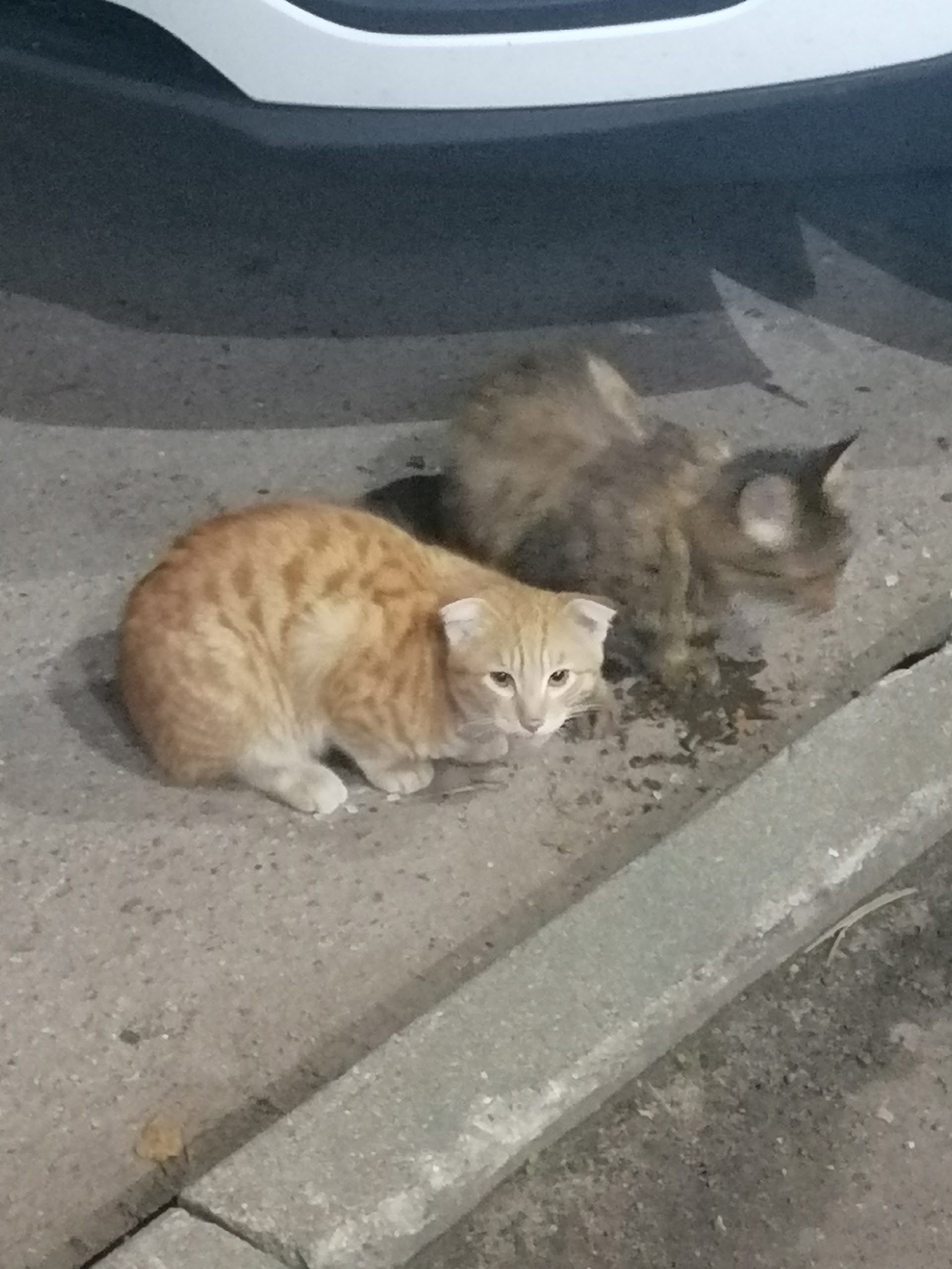 Здравствуйте, только что ночью на Мельникова 10, как раз напротив 101 долматинца обнаружила рыжего котика и вот такую кошечку. Выглядят молодо. Котик вислоухий. Сразу накинулись на еду, людей не особо боятся. Может, кто что знает, пропадали ли такие котики у кого?