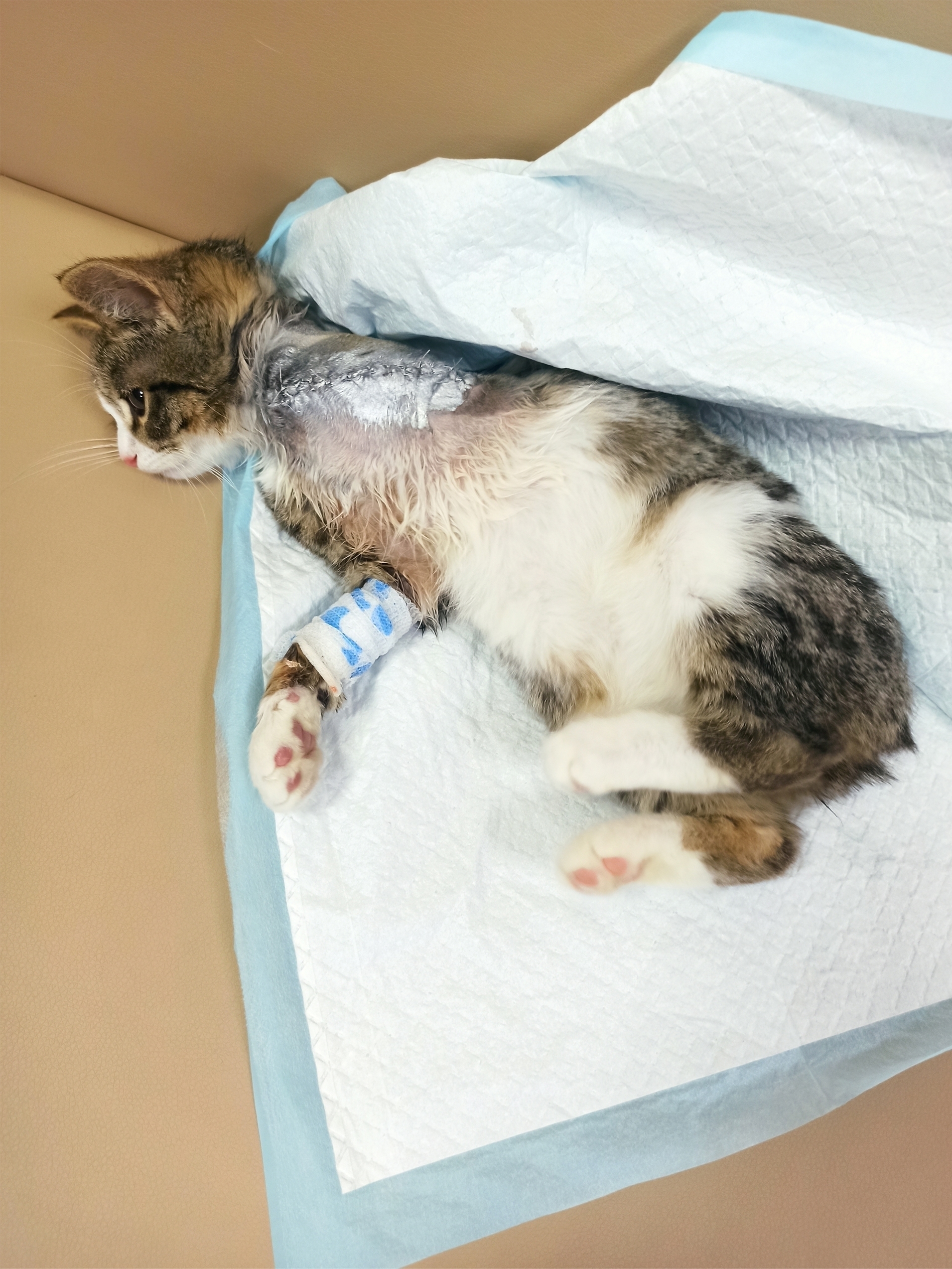 Здравствуйте. У меня 7 котов. Больных, выброшенных подобрала с улицы. Котёнка Серёжу мне отдала женщина, которая на него давала объявление. Котёнок был со сломанной плечевой костью и оторванным хвостом. Возила в клинику за 100км на операции 4 раза. В ветклинике ему сделали операции: ампутацию передней левой лапы и хвоста. Вынуждена была оставить его у себя. У нас совсем нет еды. Обращаюсь за помощью. Очень нужен корм и капли от блох. Тому кто отправит посылочку пришлю видео.