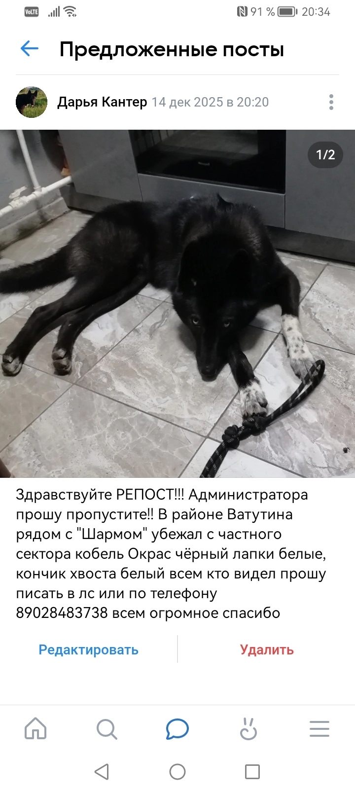 Здравствуйте убежал кобель в районе частного сектора по ул Ватутина убежал кобель в районе” Шарма ” окрас чёрный лапки белые кончик хвоста белый всх кто видел напишите пожалуйста в лс или по телефону вознаграждение гарантирую 89028483738 Дарья