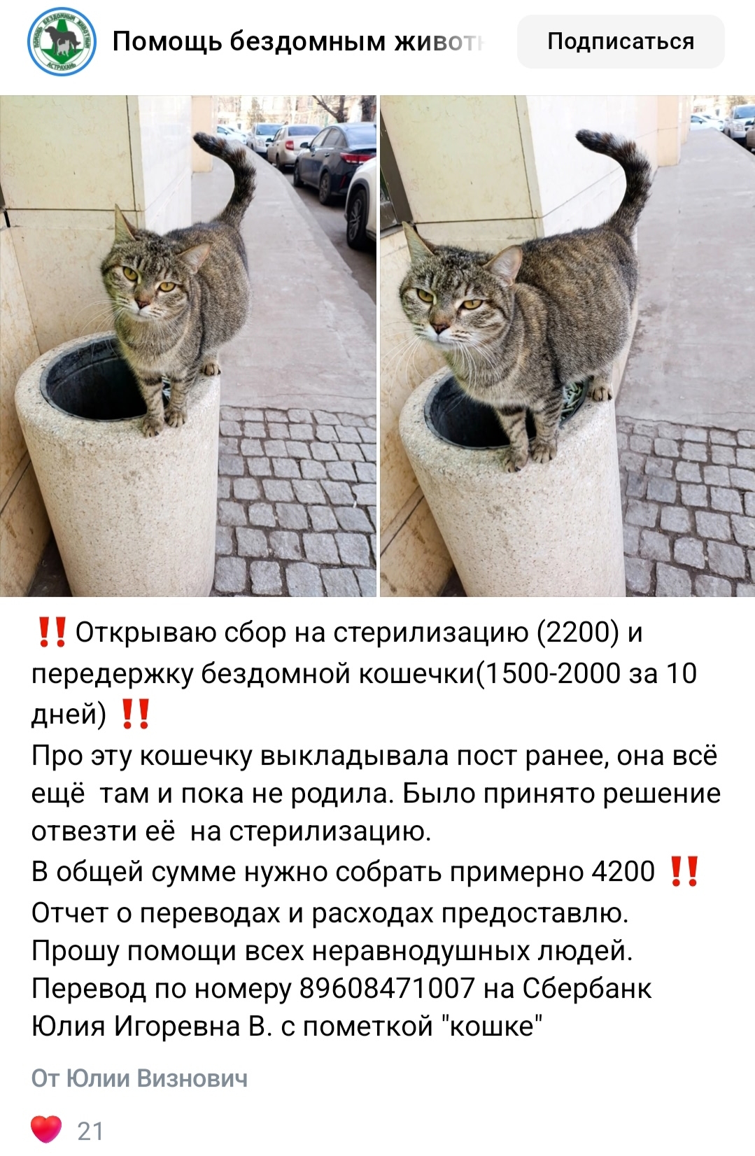 Здравствуйте, в данной группе выложен пост о кошке уличной, некая женщина собирает деньги, чтобы кошку стерилизовать с котятами, а если кошка родила, то все равно стерилизовать. Прошу помогите, может кто может забрать кошку, ведь наоборот хорошо когда кошки, крыс нет. В той группе кто в защиту кошки, тех блокируют. Зачем, если это неё кошка стерилизовать! Кошка находится у Премиум Холла. В группе все написано. Пожалуйста заберите кошку, дайте ей возможность ещё иметь котят! Сообщество Помощь бездомным животным Астрахань. Там пост. Прикладываю ссылку сообщества https://vk.ru/anymalsastrakhan