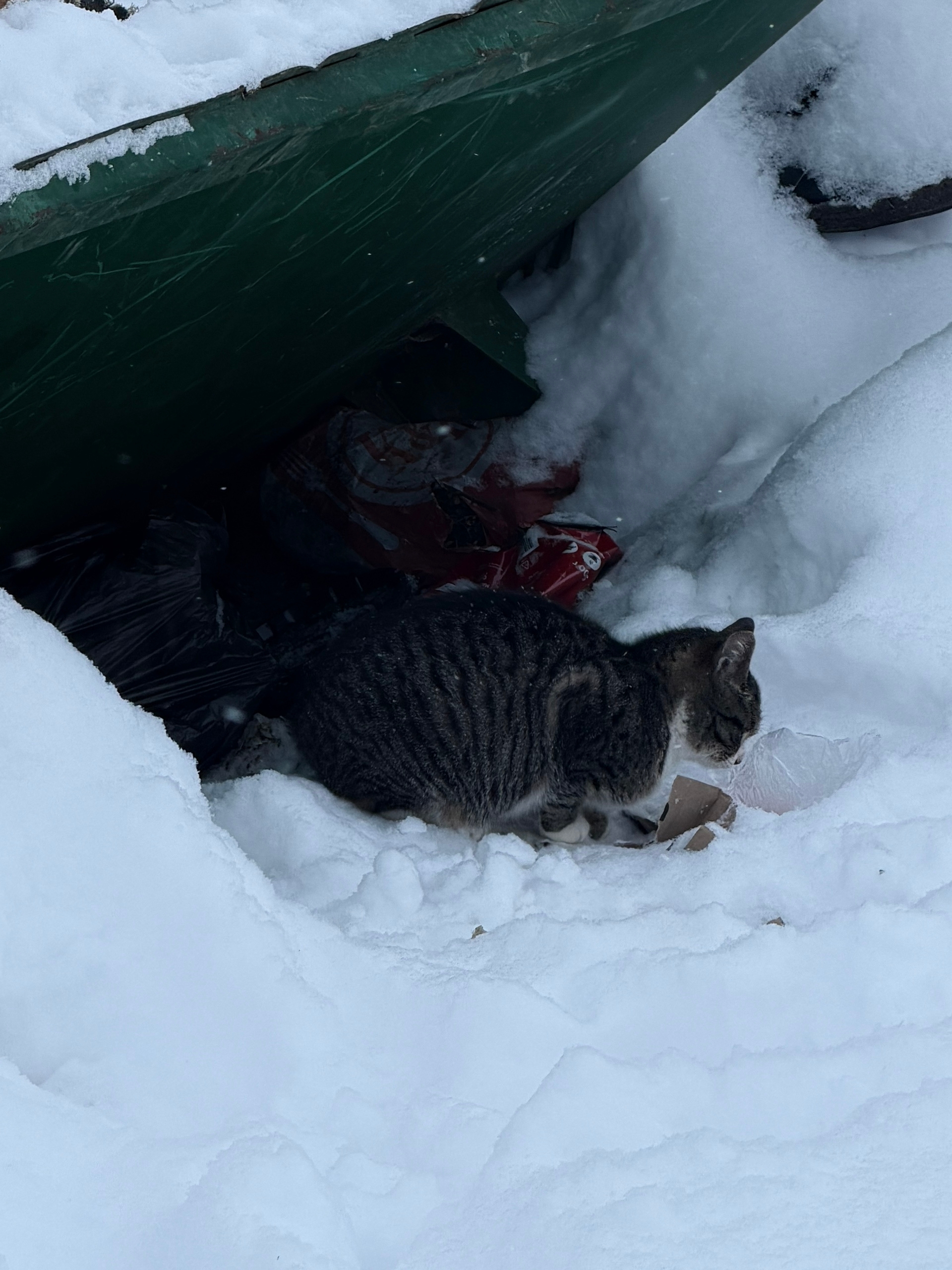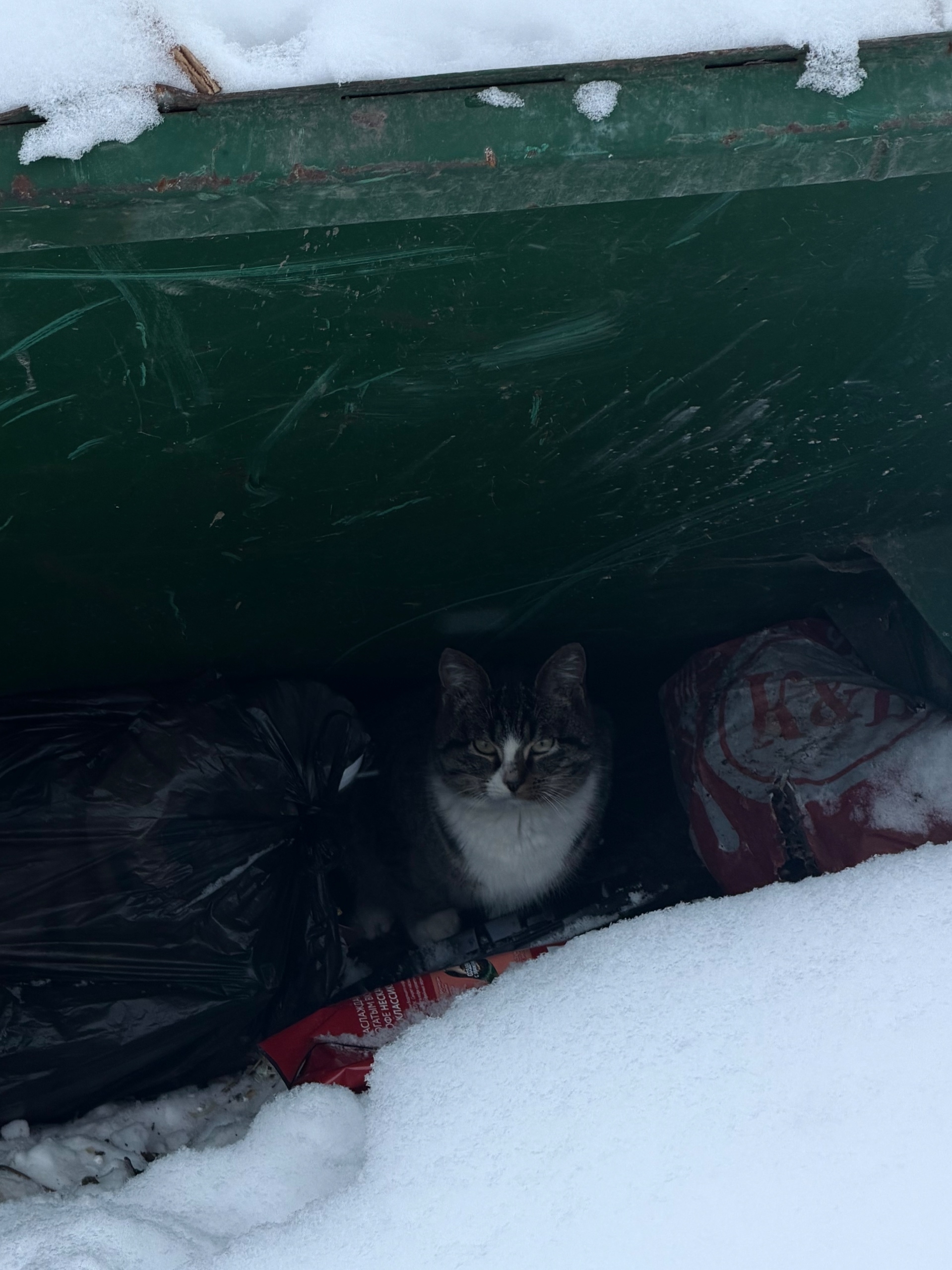 Здравствуйте. В деревне Некрасово на улице Тихая(за костромкой) на мусорке живет такой котик. Между домами 21 и 22. Видно, что котик еще не взрослый , так как размером маловат. Может он домашний? Может кто-то знает, чей он? Я не местная, забрать его не могу, пока здесь была ходила кормила! Очень жалко его, живет под баками в такие холода 🥺 Дрожит!