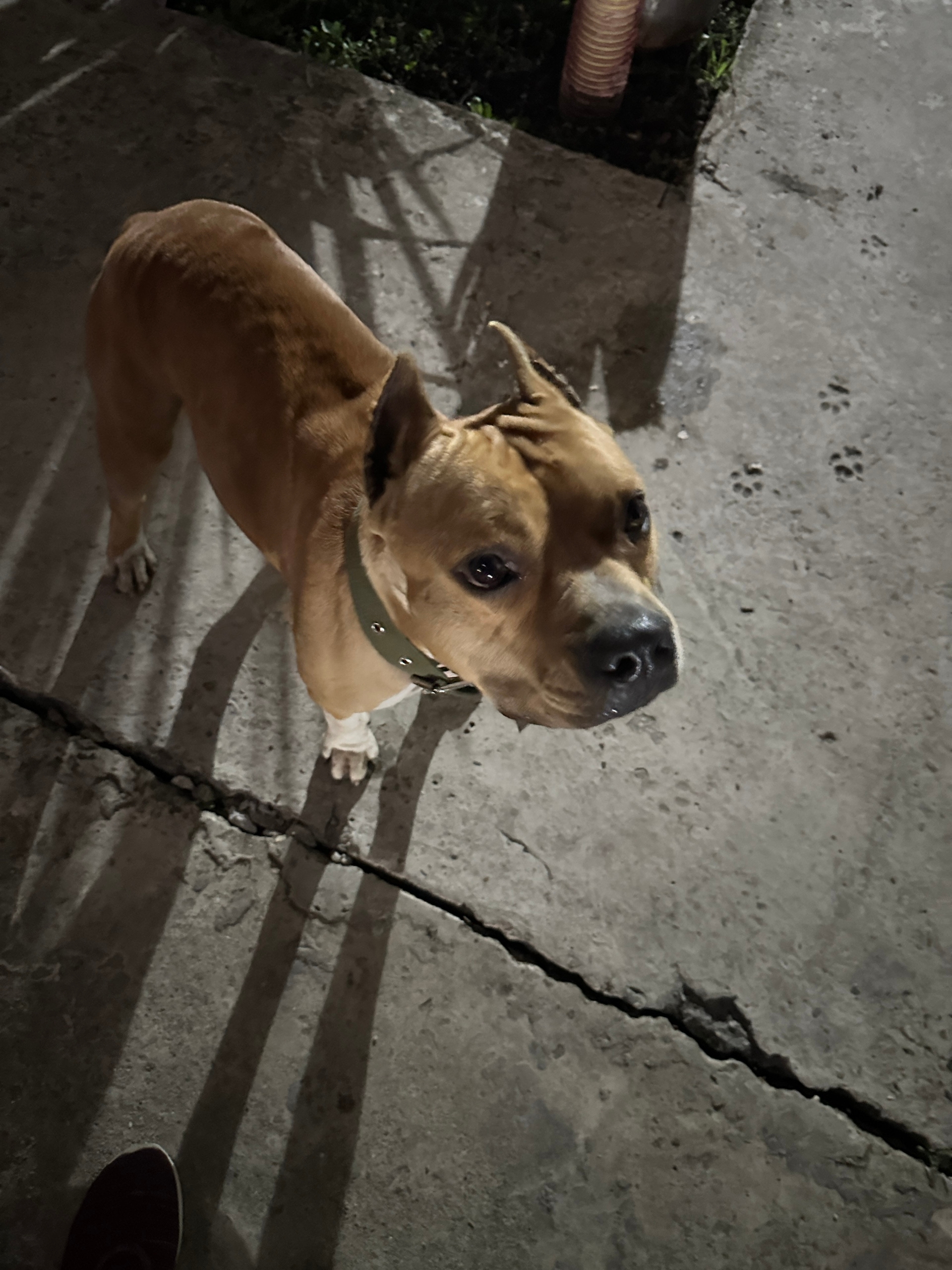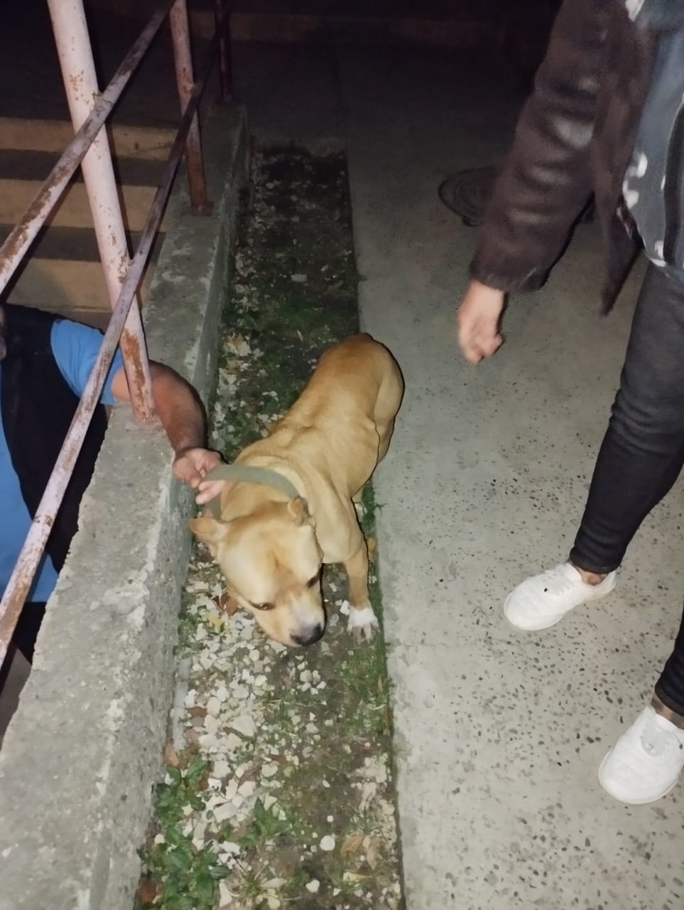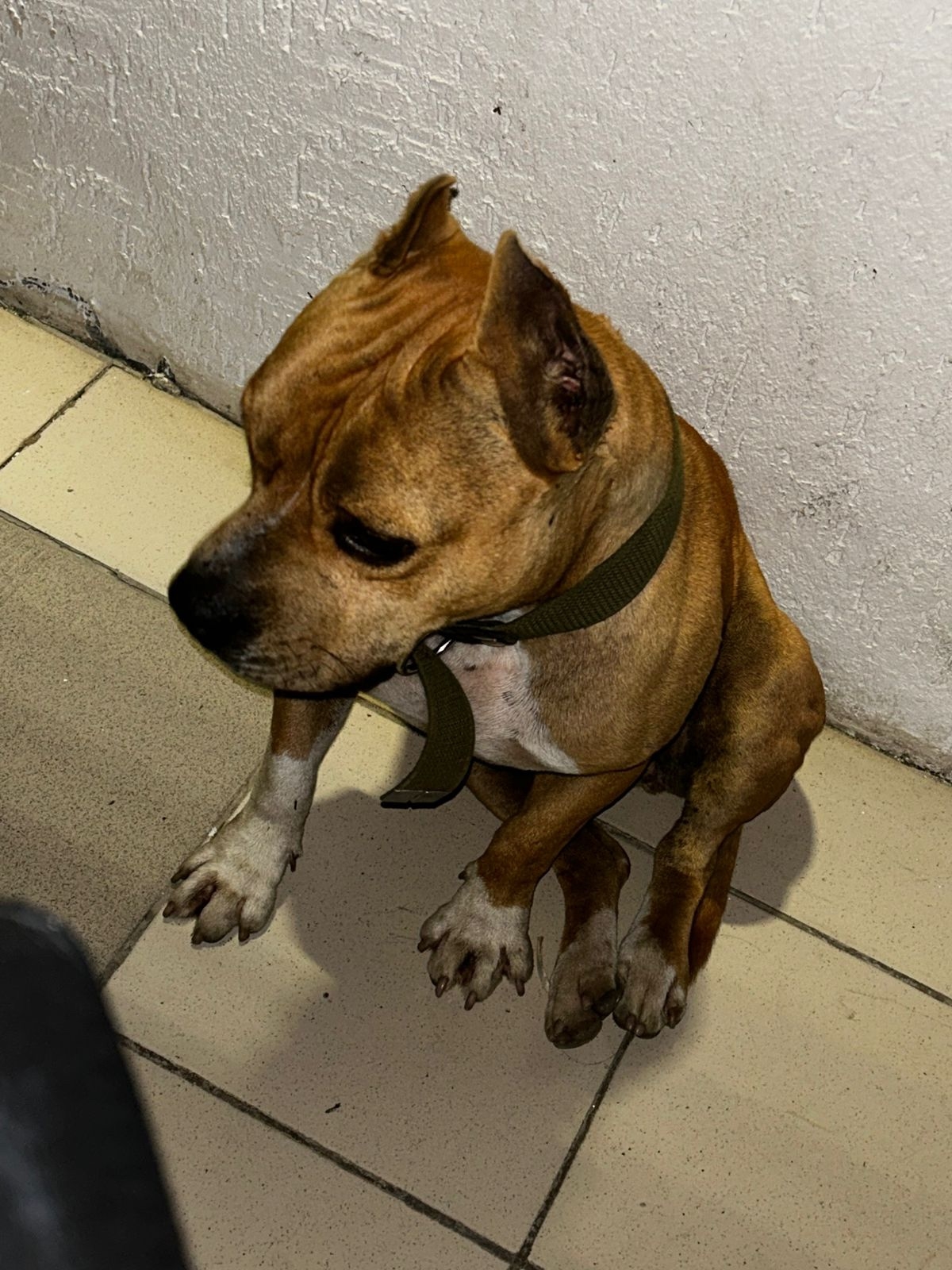 Здравствуйте. Во дворе пер. Северный д.1 (на данный момент она в подъезде #10)бегает собака породы Стаффордширский терьер, кабель, светлого окраса, с ошейником, пугливая. Хозяин отзовись!