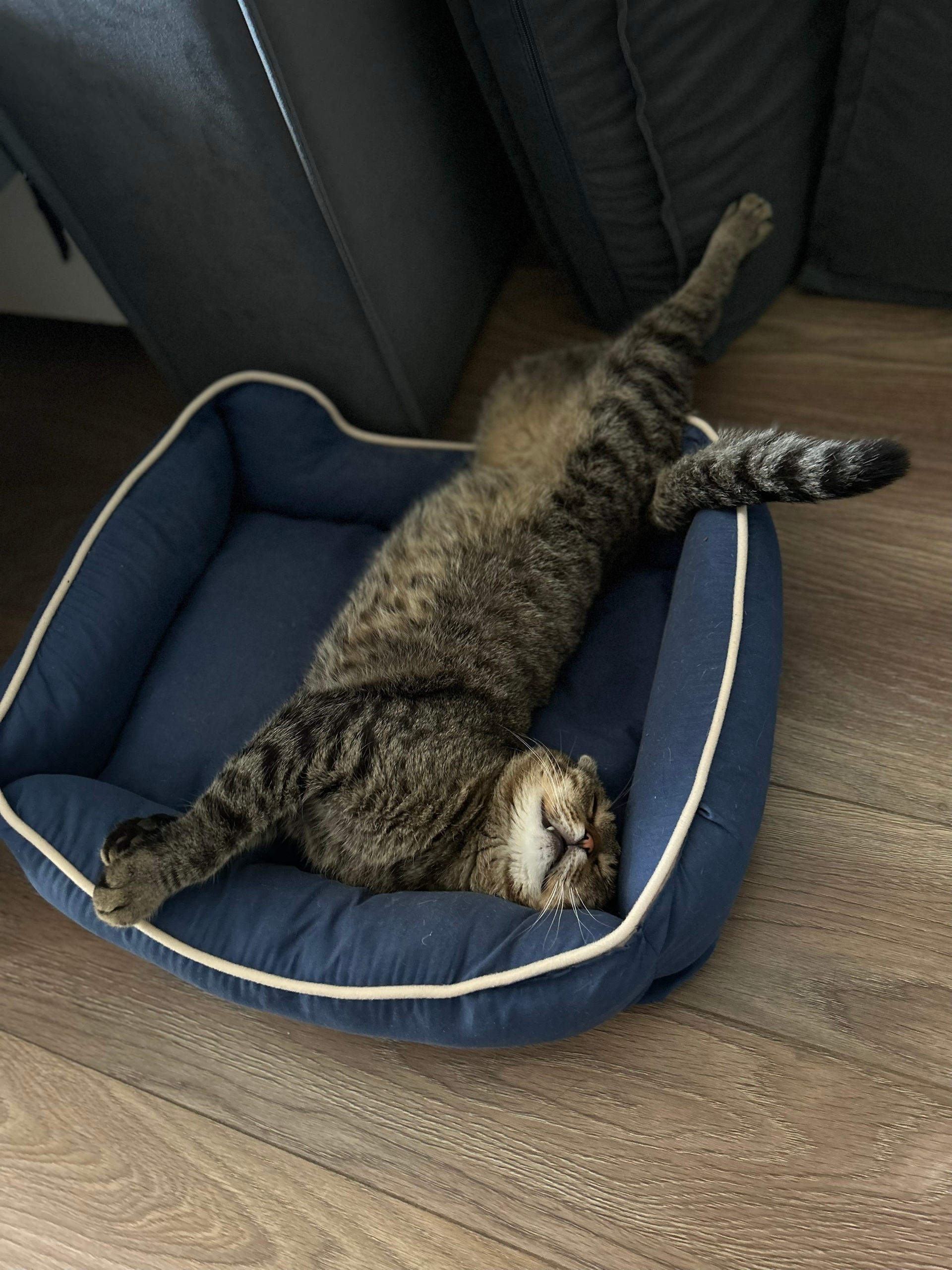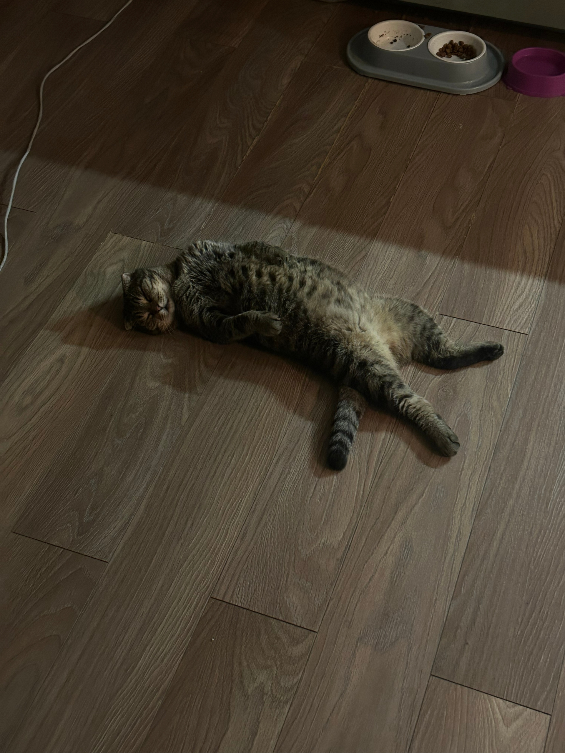 Очень спокойный ,много спит ,кушает корм сухой и жидкий )лоток на 5+