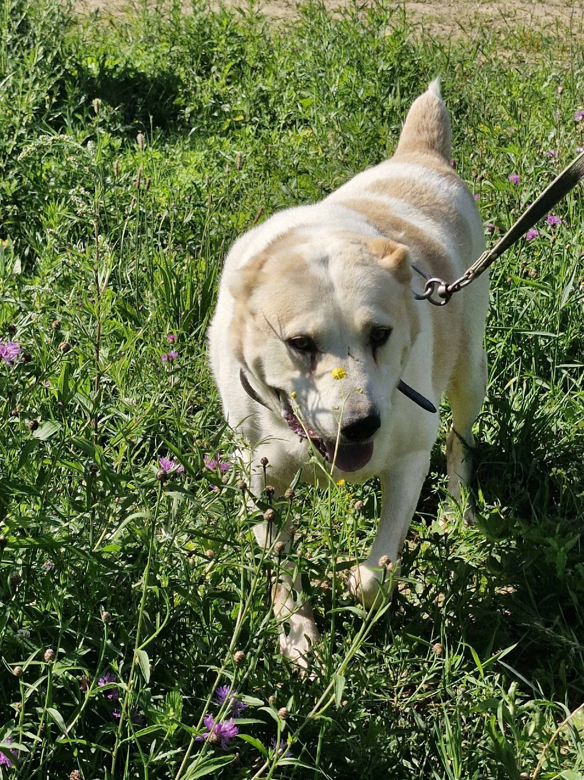 На прогулке он пока немного стесняется, предпочитает тихонько прижиматься к ногам и даже выходить из вольера не спешит. Но за этой робостью скрывается нежный, ласковый и добрый великан. С другими собаками Беляш дружелюбен, агрессию не проявляет.
