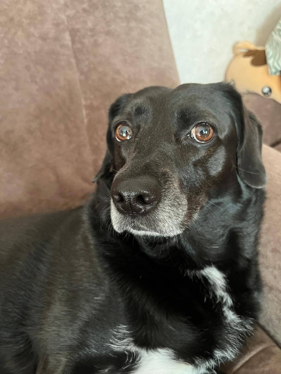 Метис лабрадора. Окрас: чёрная с белой грудкой, на трёх лапах есть белые отметины. Размер: небольшая, около 11 кг, чуть ниже колена.